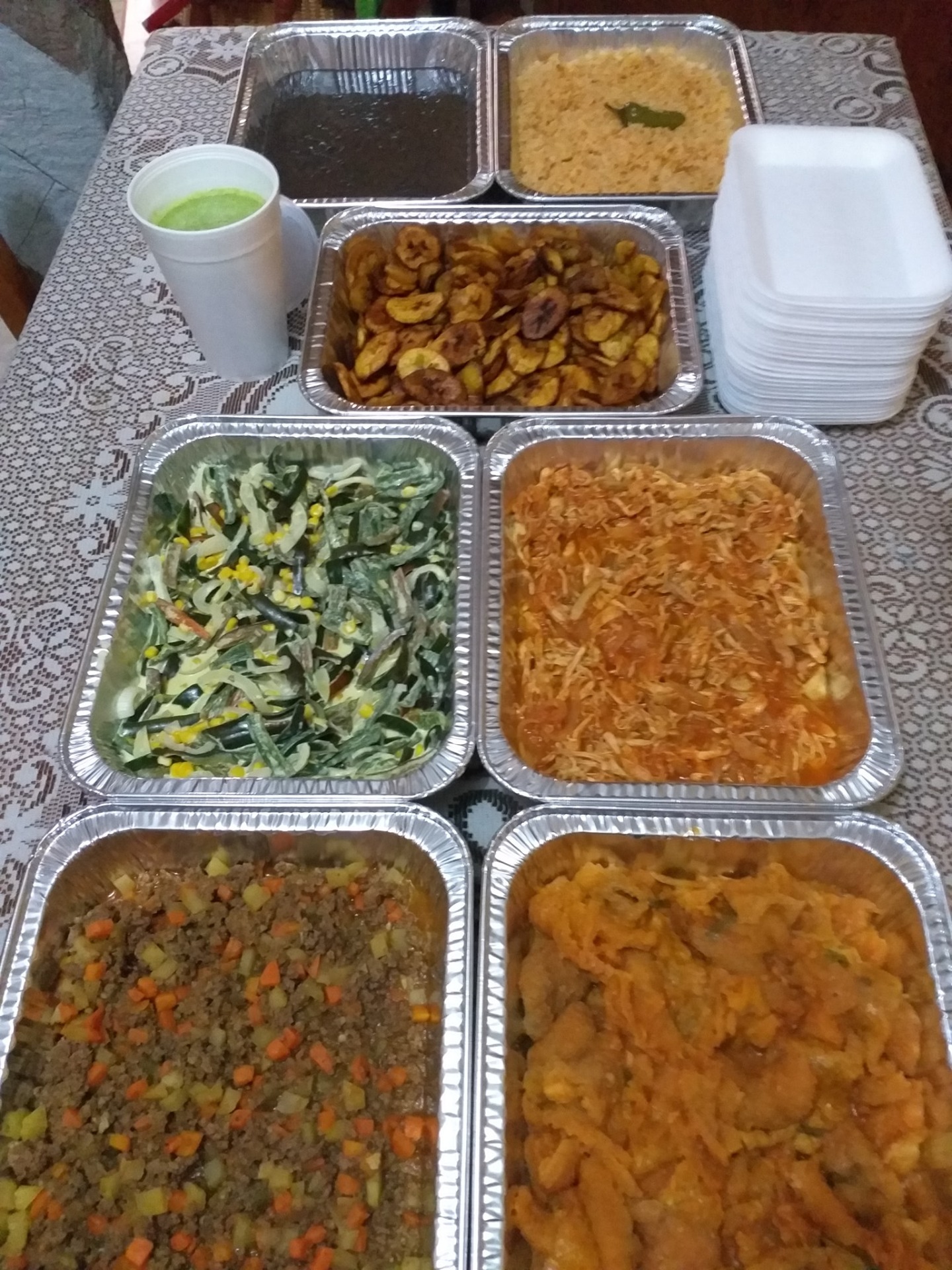 Incluye: 1 kilo de guiso de pollo, 1 kilo de guiso de res, 1 kilo de guiso de puerco o guiso sin carne, 1 kilo de arroz blanco o rojo, 1/2 kilo de frijoles refritos, vaso de 300 ml de salsa verde o roja a su elección, 1 kilo de tortillas de maíz, 2 refrescos jarritos de 2 litros (varios sabores).